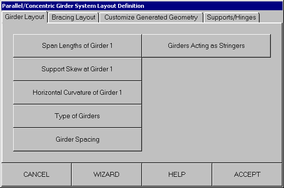 The input associated with each category is further organized into subcategories, each with an associated button which asks a question or series of questions to specify, review, or change a given category of input. The WIZARD button asks the questions that are associated with a group of these buttons to cover the primary Layout Definition information in one sweep.